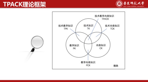 它實際上是概括了,或者是抽象出了我們在教師培養過程當中需要在職教師、師范生們需要掌握的幾個方面的能力。“技術、教學法、學科知識”這三個方面的知識有相互之間的融合交叉在一塊兒,對于我們在職教師、師范生來說,都需要既能夠在學科知識上,也能夠在教學法上,更能夠在這三者交叉的部分都能夠形成專業性知識體系,也就是說教師這個身份不是沒有經過訓練經歷的人都能達到。
