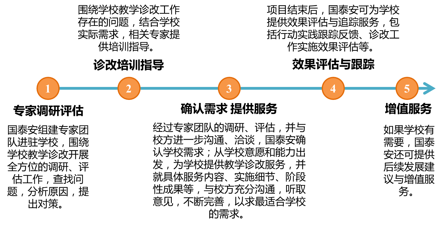 圍繞教學(xué)診改,國泰安組建由診改專家、專業(yè)研究人員、專業(yè)技術(shù)人員組成的專門項(xiàng)目團(tuán)隊(duì),以學(xué)校實(shí)際需求為導(dǎo)向,整體規(guī)劃相關(guān)產(chǎn)品開發(fā)和服務(wù)內(nèi)容,按照專家調(diào)研評(píng)估—診改培訓(xùn)指導(dǎo)—確認(rèn)需求、提供服務(wù)—效果評(píng)估與跟蹤—增值服務(wù)等步驟,分步推進(jìn),有序開展,不斷改進(jìn)。