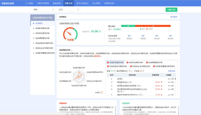 云南機(jī)電職業(yè)技術(shù)學(xué)院:根據(jù)學(xué)校教育教學(xué)實(shí)際情況,梳理5套指標(biāo)庫,共計(jì)261個(gè)指標(biāo),以滿足學(xué)校質(zhì)量診斷的需求;在學(xué)校現(xiàn)有的信息化基礎(chǔ)上,建設(shè)校本數(shù)據(jù)中心和質(zhì)量保證系統(tǒng),實(shí)現(xiàn)學(xué)校各項(xiàng)業(yè)務(wù)數(shù)據(jù)的互聯(lián)互通,實(shí)時(shí)診斷學(xué)校質(zhì)量狀態(tài),及時(shí)發(fā)現(xiàn)質(zhì)量問題。
