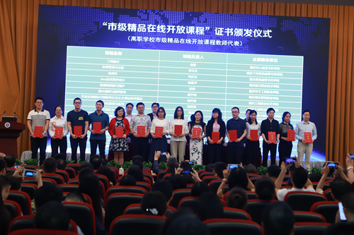 市教育技裝中心黨總支書記、市課程協(xié)作組副主任姚友明宣讀了重慶市高校第二批精品在線開放課程認定結(jié)果,與會領導一起為獲得市級精品在線開放課程認定的本科及高職的教師代表頒發(fā)了認定證書。
