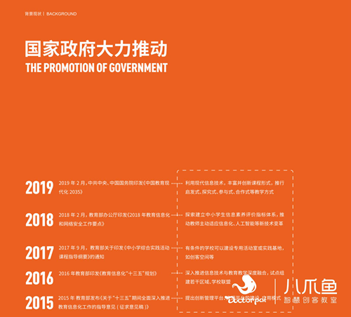 自2015年,教育部發布《關于“十三五”期間全面深入推進教育信息化工作的指導意見(征求意見稿)》以來,如何培養當前青少年的創造力,成為社會關注的問題。社會開始推動校園教育在這方面的落實,為高知專業人才的培養打下基礎,創客教育、STEAM教育成為教育行業的“高頻口號”,也成為了八爪魚教育的核心詞。