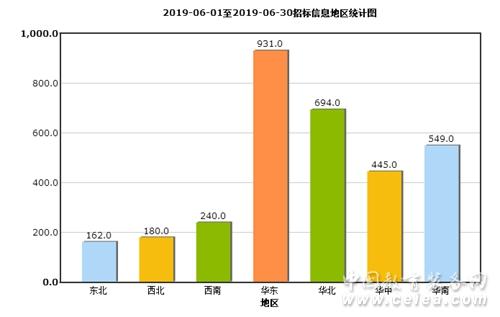 通過上述數據可知:地區分布中,華東地區以其涵蓋省份多,經濟水平高等因素占比最大。6月份各地區招標采購信息量分布較為均衡,除華東、西北地區招標采購信息量出現一定程度的下降外,其他地區招標采購信息量具有一定程度的增長,其中東北地區漲幅較大。具體到省份當中,廣東、河北、福建、河南的招標采購信息量相比較多。