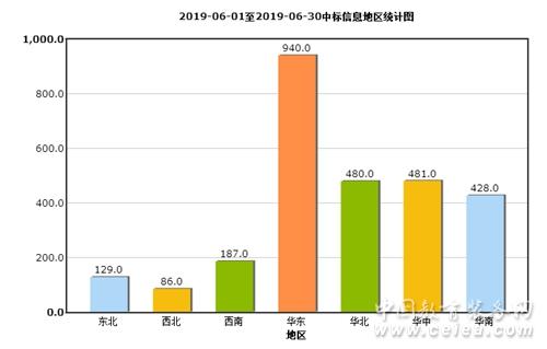 從6月中標信息地區統計圖(如圖8所示)和全國中標信息地區占比圖(如圖9所示)來看:華東地區中標信息量為940條,占比34%;華中地區中標信息量為481條,占比18%;華北地區中標信息量為480條,占比17%;華南地區中標信息量為428條,占比16%;西南地區招中標信息量為187條,占比7%;東北地區中標信息量為129條,占比5%;西北地區中標信息量為86條,占比3%。