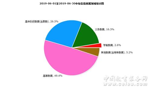 6月中標信息所屬領域統計圖,如圖10所示:學前教育占比為2.6%;義務教育占比為16.3%;高中階段教育(含職教)占比為26.5%;高等教育占比為49.4%;其他教育(含特殊教育)占比為5.2%。