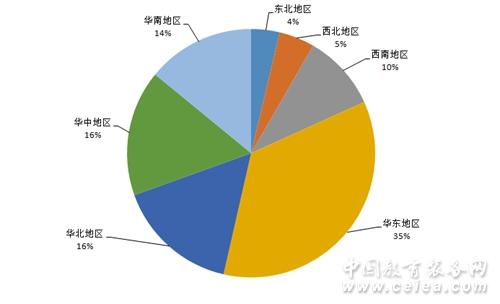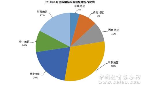 從9月招標采購信息地區統計圖(如圖3所示)和全國招標采購信息量地區占比圖(如圖4所示)可以看出:華東地區招標采購信息量為1341條,占比30%;華北地區招標采購信息量為879條,占比20%;華南地區招標信息采購量為760條,占比17%;華中地區招標采購信息量為454條,占比10%;西南地區招標采購信息量為416條,占比10%;西北地區招標采購信息量為381條,占比9%;東北地區招標采購信息量為193條,占比4%。