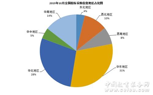 地區(qū)數(shù)據(jù)結(jié)果表明:10月份各地區(qū)招標(biāo)采購信息量與去年同期相比,除華中地區(qū)外,其他地區(qū)均呈現(xiàn)大幅增長趨勢,與上月相比,除華北地區(qū),其他地區(qū)均有不同程度的下降。省份當(dāng)中,河北、北京,廣東、福建、山東等省份的招標(biāo)采購信息量較高。地區(qū)數(shù)據(jù)的不同主要由來自地區(qū)經(jīng)濟、教育政策、教育投入等因素的影響。