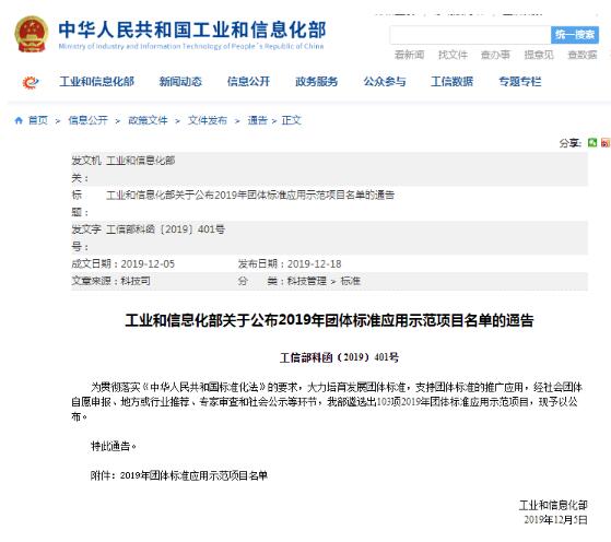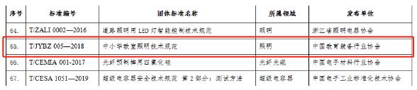 12月18日,中華人民共和國(guó)工業(yè)和信息化部發(fā)布《關(guān)于公布2019年團(tuán)體標(biāo)準(zhǔn)應(yīng)用示范項(xiàng)目名單的通告》(工信部科函〔2019〕401號(hào)),遴選出103項(xiàng)2019年團(tuán)體標(biāo)準(zhǔn)應(yīng)用示范項(xiàng)目。由中國(guó)教育裝備行業(yè)協(xié)會(huì)發(fā)布并歸口的團(tuán)體標(biāo)準(zhǔn)T/JYBZ 005—2018《中小學(xué)教室照明技術(shù)規(guī)范》成功入選工信部2019年團(tuán)體標(biāo)準(zhǔn)應(yīng)用示范項(xiàng)目,見圖1。
