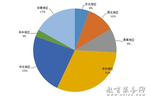 根據4月份教育裝備招標采購信息地區統計圖(見圖3)和占比圖(見圖4)可以看出:華東地區需求量最大,其招標采購信息量862條,占全部信息量的31%;其次是華北地區,其招標采購信息量647條,占全部信息量的23%;華南地區招標采購信息量468條,占全部信息量的17%,位列第三;西北地區招標采購信息量298條,占全部信息量的11%;位列第四;西南地區招標采購信息量262條,占全部信息量的9%,位列第五;東北地區教育裝備招標采購信息量157條,占全部信息量的6%,位列第六;華中地區招標采購信息量76條,占全部信息量的3%,排在末位。