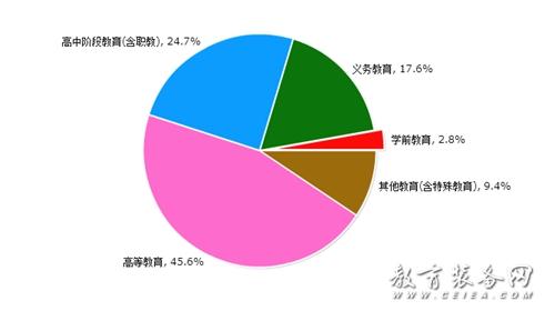 根據4月份教育裝備招標采購信息量所屬領域統計圖(見圖6)可以看出:高等教育招標采購信息量占比最大,占全部信息量的45.6%;學前教育招標采購信息量占比最小,占全部信息量的2.8%。其他高中階段教育(含職教)招標采購信息量占全部信息量的24.7%,義務教育招標采購信息量占全部信息量的17.6%,其他教育(含特殊教育)招標采購信息量占全部信息量的9.4%。
