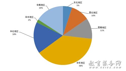 從4月份教育裝備中標信息地區統計圖(見圖8)和占比圖(見圖9)可以看出:華東地區中標信息量790條,占全部信息量的38%;華北地區中標信息量361條,占全部信息量的18%;華南地區中標信息量328條,占全部信息量的16%;西南地區中標信息量236條,占全部信息量的11%;西北地區中標信息量213條,占全部信息量的10%;東北地區中標信息量106條,占全部信息量的5%;華中地區中標信息量36條,占全部信息量的2%。