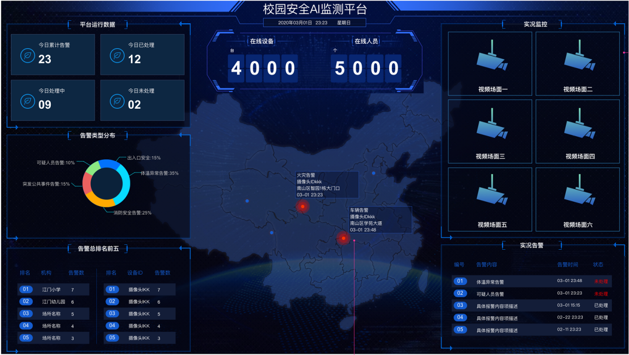 管理平臺綜合三大防(人防、物防、技防),將校園內所有人、事、物、場景集中在此平臺上呈現。教育管理者可以在平臺上管理校園內所有人員動態、管理流程、系統設備等,進行科學管理與決策。同時平臺與多個區域級、市級系統管理平臺對接,打通與公安系統、消防系統、應急系統、衛健委等融合,聯動。在開展校園24小時實時監控時,如發生預警,可根據事先制定相應的預案流程,智能分析,及時作出響應進行聯動執行,全方位保障學校師生安全。