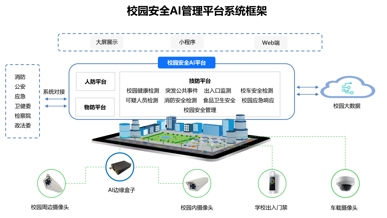 校園安全AI安全平臺基于實際的校園安全場景,構建基于物聯網、大數據和人工智能等新技術的AI管理平臺,為校園安全的日常管理工作提供智能化支撐。