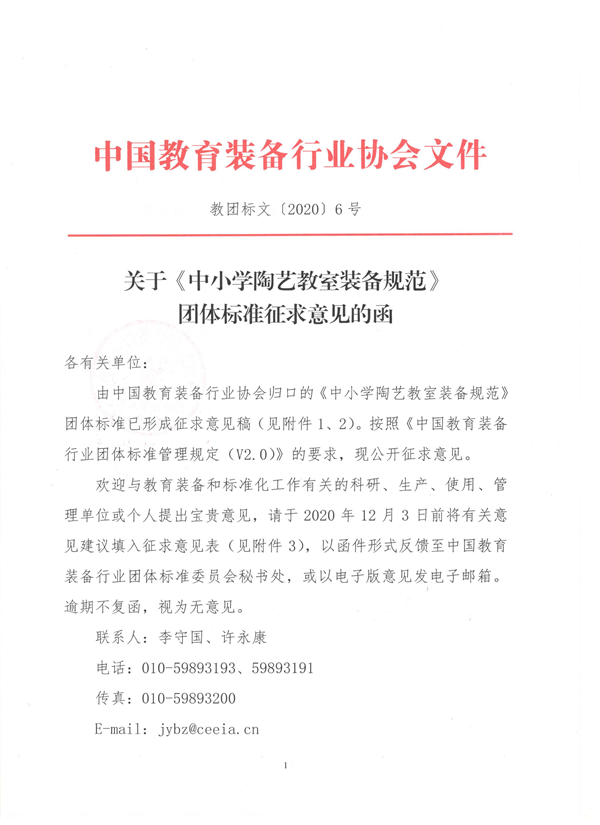 中國(guó)教育裝備行業(yè)協(xié)會(huì)團(tuán)體標(biāo)準(zhǔn)委員會(huì)關(guān)于《中小學(xué)陶藝教室裝備規(guī)范》團(tuán)體標(biāo)準(zhǔn)征求意見的函
