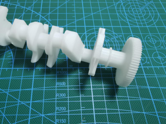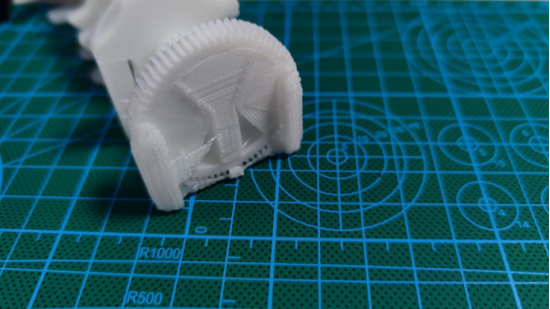 白色耗材為極光爾沃官方PLA耗材,打印的零件表面基本找不出瑕疵,十分光滑,作為運動件也不需要在拋光即可使用。通過墊板上的測量尺可以對比出來,第2張圖的小齒輪間隙只有約3mm,然而即使是如此細小的細節(jié),A6也將其完美的還原了出來,并沒有出現(xiàn)我們意料中可能出現(xiàn)的變現(xiàn)情況。