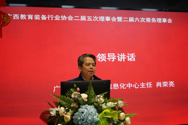 “陽春布德澤,萬物生光輝。”2021年3月3日,廣西教育裝備行業協會二屆五次理事會暨二屆六次常務理事會順利召開。廣西教育技術和信息化中心主任肖榮亮、副主任陳軍、廣西政府督導室副主任、國家教育部特邀督學王濱、專家組組長陳鐵華老師和崇左市電教儀器站長許華方、桂林市電教儀器站副站長鄒世喜到會指導,協會會長、常務副會長、副會長等理事會代表及企業代表90余人參加了會議。