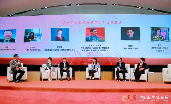 閱讀沙龍環節,由中國出版協會少兒閱讀推廣聯盟主席、中國少年兒童新聞出版總社原社長李學謙主持,邀請人民文學出版社副社長王秋玲,海峽出版發行集團副總經理何強,接力出版社副總編郭樹坤,成都市天涯石小學昭忠祠分校校長黃彬,超星集團有限公司副總經理劉煥閣為嘉賓,圍繞“青少年優秀讀物進校園”主題作交流分享。