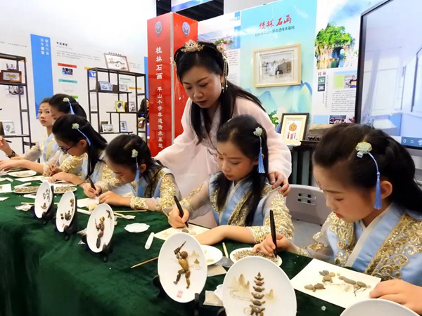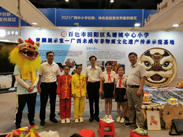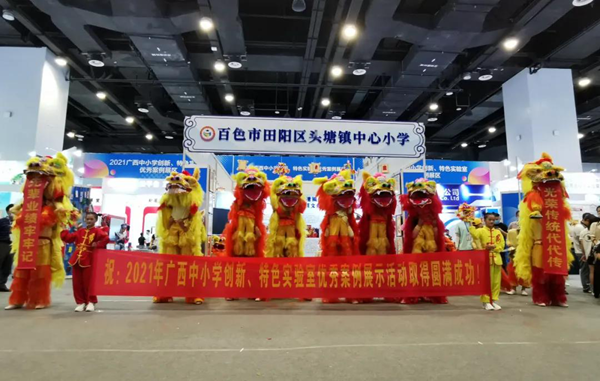 由廣西教育廳主辦的2021廣西中小學創新、特色實驗室優秀案例展區的展位個個都布滿了民族特色,有壯、瑤,苗、侗等多個民族展位,參加本屆優秀案例的縣(區丿學校有49個,布展主要內容有童獅、壯族蜂鼓、侗族木構手工、剪紙、金絲沙畫等民族項目。