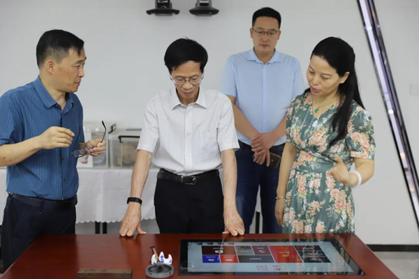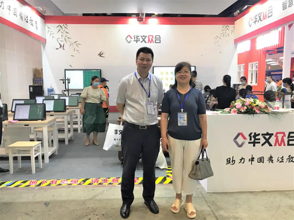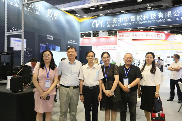 廣西教育裝備行業協會創會會長陳鐵華(左三)、河北省教育裝備中心主任郭晉保(右三)蒞臨展位