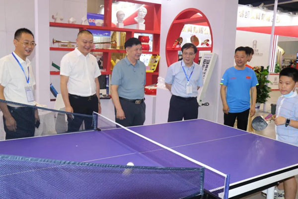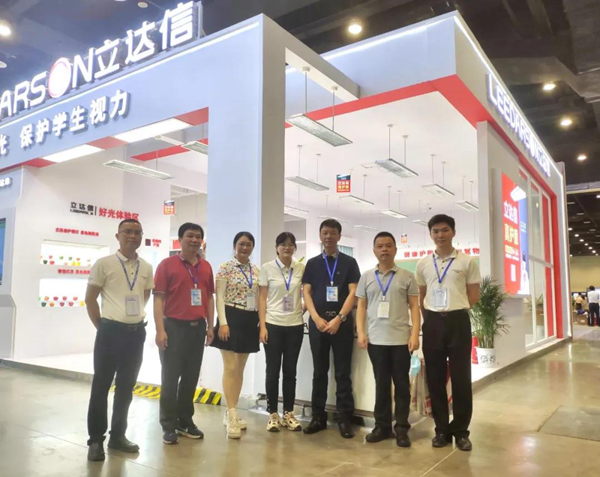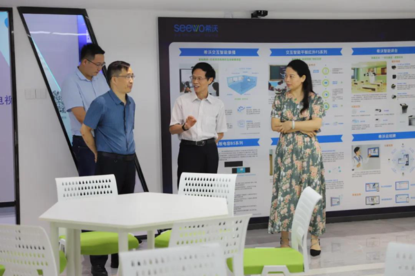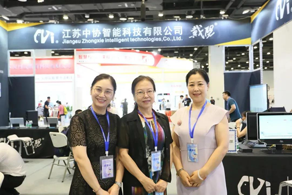 深圳市教育裝備行業協會會長彭錦環(右三)、黨支部書記李山(右二)、福建省教育裝備行業協會副秘書長陳鴻(左二)蒞臨展位