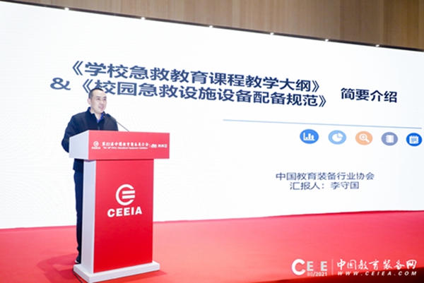 中國(guó)教育裝備行業(yè)協(xié)會(huì)李守國(guó)在會(huì)上介紹了《校園急救設(shè)施設(shè)備配備規(guī)范》的編制情況,并代表全國(guó)校園急救教育試點(diǎn)工作辦公室正式發(fā)布了《學(xué)校急救教育課程教學(xué)大綱(試行)》。