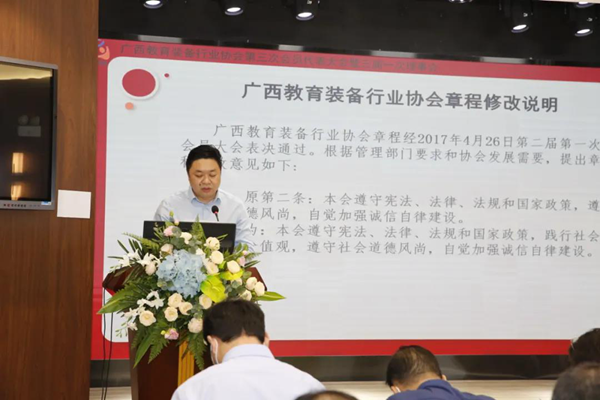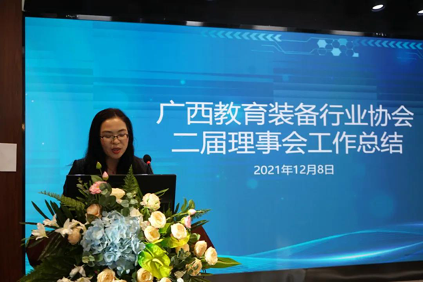 張珊會長向大會報告二屆理事會工作情況。她全面總結了協會4年來取得的成就:一、把握正確的政治導向,堅定永跟黨走的信念,行業內風清氣正;二、為行業和會員服務,引領教育裝備發展方向:打造專業品牌展會,打造玉蘭路小學、相思湖學校兩所示范園校,打造教育裝備展示體驗中心,為企業搭建橋梁;三、服務課堂教學,把裝備應用工作作為重點工作之一,組織多種形式的學術論壇和研討會,協助區教育廳、教研院組織教師技能培訓,提高教師的專業素養;四、承擔社會責任,開展公益捐贈,4年來共為廣西各級教育部門捐贈教學儀器達3000多萬元;五、優化內部組織結構,設立了3個分會和1個專業委員會,充分發揮分會的優勢,使協會工作更細化,管理更深化,效能更優化;六、為外地的教育裝備廠家架設了與廣西教育部門的橋梁,助力外地企業在廣西市場的開拓。