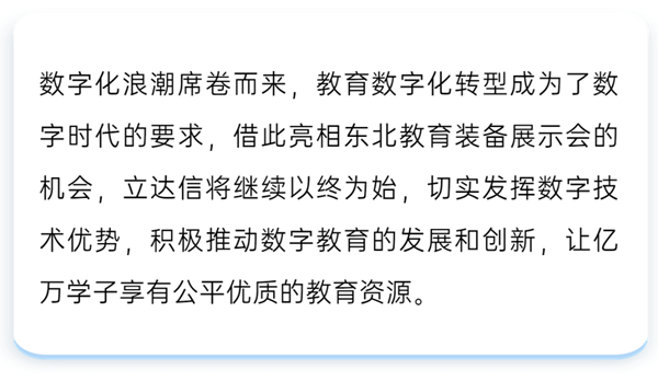 教育是國之大計,黨之大計,教育裝備是培養學生創新能力和實踐能力,促進學生全面發展的重要載體。為了更好地推動數字教育的技術、模式、業態和制度創新,由中國教育裝備行業協會主辦,中國教育裝備行業協會未來教育裝備分會、吉林省教育技術裝備中心、吉林省教育裝備行業協會承辦,廈門立達信數字教育科技有限公司協辦的“深化教育數字化轉型——推動教育裝備高質量發展”交流活動在展會期間展開。