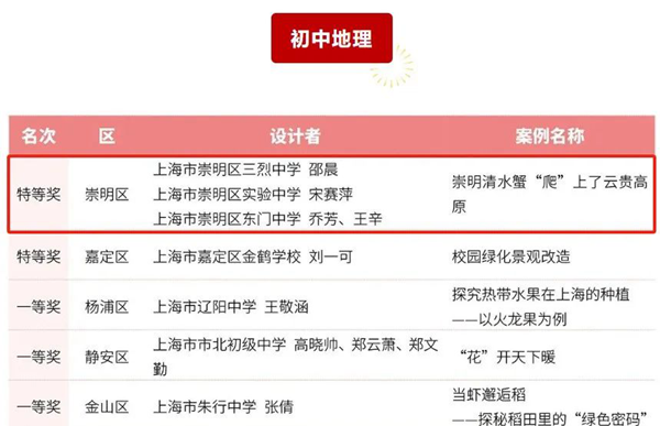 今年9月,由范俊明老師指導的上海市邵晨老師團隊制作的《崇明清水蟹“爬”上了云貴高原》課例也榮獲了上海市“跨學科主題學習典型案例征集活動”特等獎。