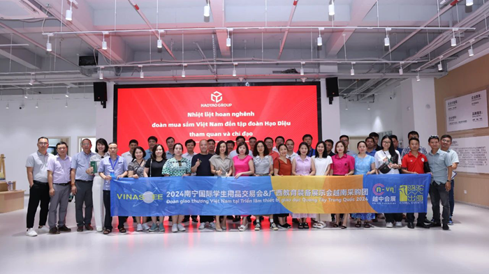 越南采購商赴廣西教育裝備代表單位——廣西南寧市浩耀服飾有限公司數字現代化生產車間和南寧四軒科教辦公用品有限公司廠房實地參觀考察,實地感受服裝、家具生產第一線,促進中國—東盟教育交流,加強雙方經貿交流,推動中國與東盟國家間的貿易合作。
