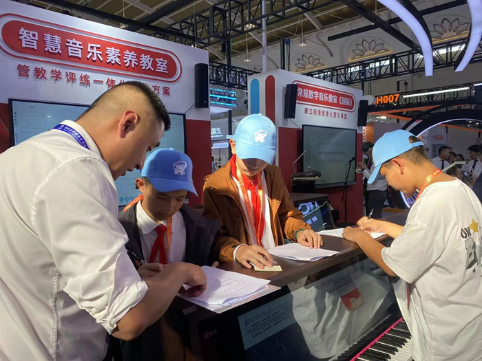 金三惠展位迎來(lái)了昆明市第十中學(xué)白沙河校區(qū)初一的學(xué)生們,他們正在進(jìn)行“行走的課堂《走進(jìn)教育裝備展,探索未來(lái)教育》研學(xué)活動(dòng)”,進(jìn)入金三惠展位,他們親身體驗(yàn)智能鋼琴與數(shù)字化教學(xué)軟件,感受到了數(shù)字化技術(shù)為音樂(lè)教育帶來(lái)的變革。