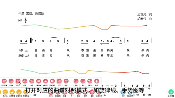 更換AI演唱的音色,打開曲譜中的旋律線、手勢圖,使音樂課更有趣味性。