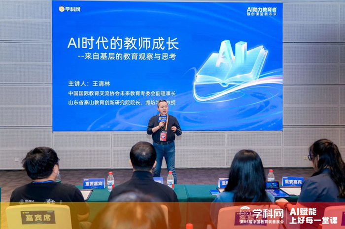 正高級(jí)研究員、國(guó)家級(jí)教學(xué)成果獎(jiǎng)一等獎(jiǎng)獲得者、山東省泰山教育創(chuàng)新研究院院長(zhǎng)王清林以《AI時(shí)代的教師成長(zhǎng)》為主題,進(jìn)行了現(xiàn)場(chǎng)分享。王清林表示,教育的本質(zhì)是教人學(xué)會(huì)思考,在人工智能背景下,陳舊的教學(xué)方式與學(xué)生真實(shí)需求之間的矛盾將會(huì)加劇,學(xué)生思辨力的提升對(duì)教學(xué)提出了更高要求。教師正成為這場(chǎng)教育變革的最大推動(dòng)者,AI時(shí)代教師可以培養(yǎng)六大素養(yǎng),包括人機(jī)協(xié)作力、數(shù)據(jù)洞察力、情感計(jì)算力、創(chuàng)新設(shè)計(jì)力、倫理判斷力以及終生進(jìn)化力。人工智能工具的普及使得教育資源均衡化發(fā)展,普通學(xué)校迎來發(fā)展機(jī)遇,任何一所學(xué)校都可以憑借特色課程脫穎而出。