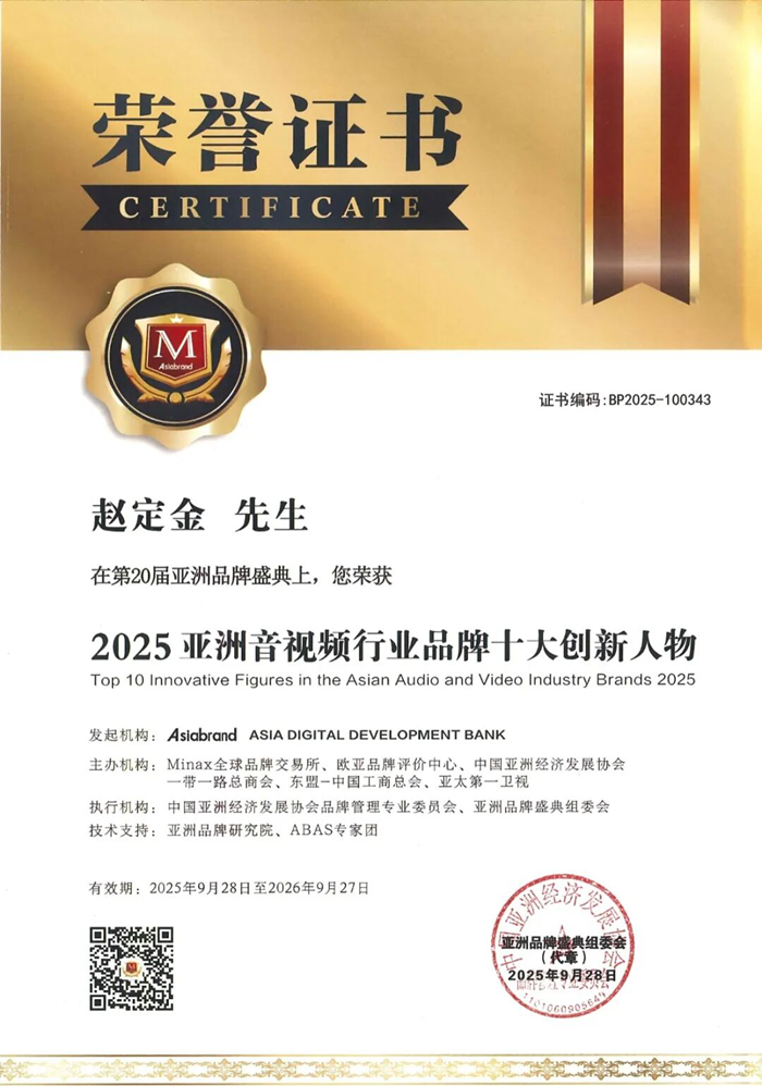 多年來,趙定金在音視頻領(lǐng)域展現(xiàn)出不懈的奮斗精神與創(chuàng)新成果,贏得了社會各界的廣泛贊譽。他先后獲得了“2024年度智能制造影響力人物”“廣東民營企業(yè)家智庫成員”“廣州市電子音響行業(yè)領(lǐng)軍人物”“杰出產(chǎn)業(yè)人才一等獎”以及“中國(行業(yè))十大創(chuàng)新人物”等多項殊榮。此次榮獲“亞洲音視頻行業(yè)品牌十大創(chuàng)新人物”稱號,既是對趙定金總裁取得非凡成就的再次肯定,也是itc創(chuàng)新發(fā)展的無限動力。