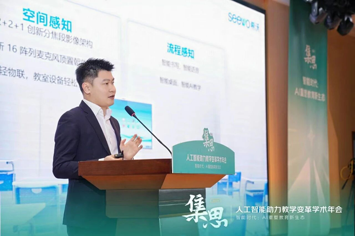 廣州視睿電子科技有限公司(希沃)總裁張凌作《“AI+教育”的實踐探索》主題報告。他分享了希沃在助力教育教學創新方面的思考與應用生態。他表示:“AI已逐漸融入教與學中,成為能更好地服務教師、學生的第三主體。技術應向善、賦能而不越位,要成為因材施教的智慧‘伙伴’,陪伴教師和學生成長。”