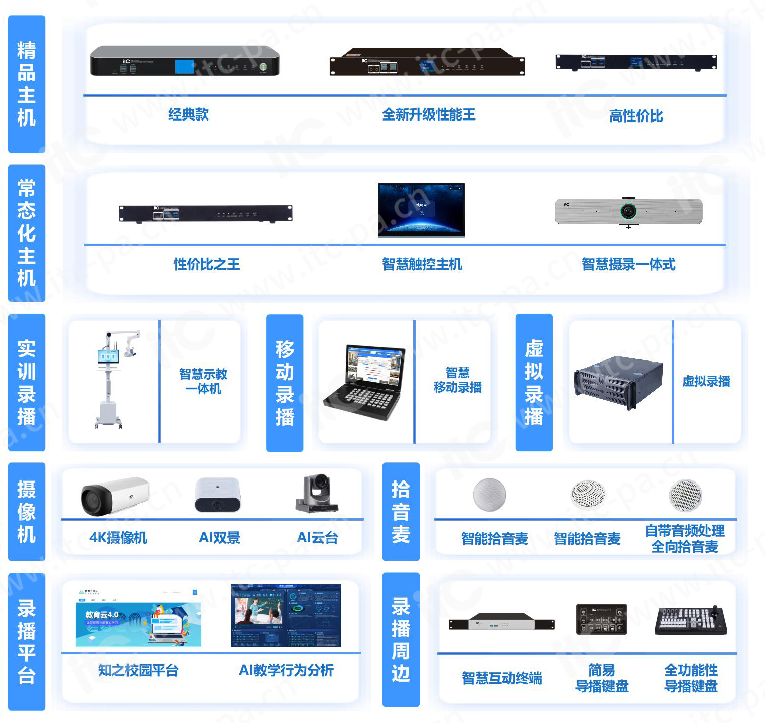 itc擁有常態(tài)化、精品機架式錄播主機、智能交互式錄播主機、攝錄一體錄播主機、移動錄播主機、實訓推車、虛擬錄播主機等錄播產(chǎn)品。