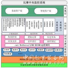 圖示是比賽中央集成管理系統(tǒng)的分層邏輯模型,整個邏輯結(jié)構(gòu)由四級中間核心層、一個通訊接口體系、一