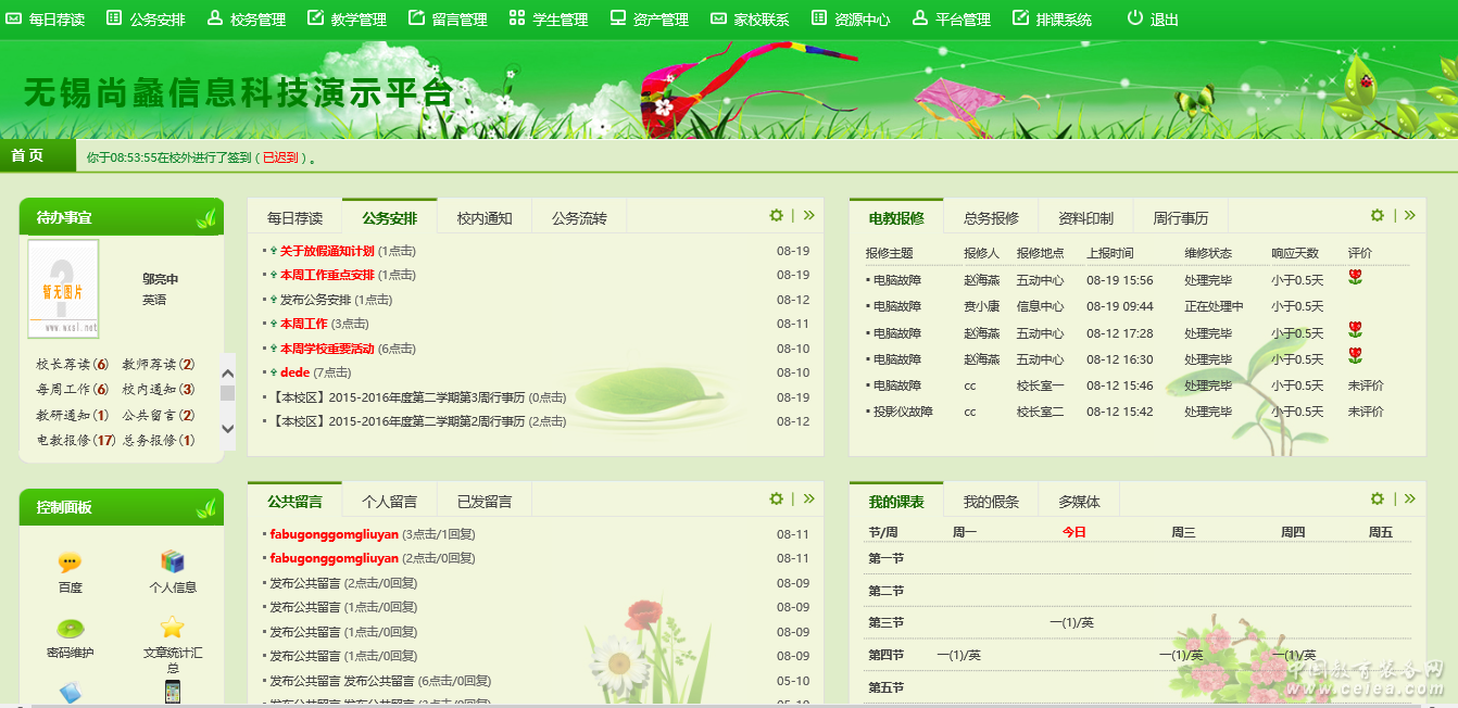 產品詳細介紹平臺管理:學校信息設置、年級設置、班級設置、部門設置、用戶管理、權限設置、教師安排、學生分班安排(含新生入學自動分班功能)、積分信用匯總、系統監控、數據備份與還原、菜單設置等。 留言管理:校內郵件系統功能,包括個人留言、公共留言、已發留言和回收站功能。 內容管理:包括校長薦讀、教師薦讀、校內通知等在內的校內信息以及校內信息管理;其中所有校內信息欄目及權限分配學校可自由定制,輕松滿足學校個性化需求。 公文/公務流轉:由簽發人、主辦人、承辦人協同將一項工作完成,公文/公務狀態包括分派中、完成、終止等。 全網檢索:文章檢索、圖片檢索、FLASH動畫檢索、媒體文件檢索、其他文件檢索(doc、xls等)、用戶檢索 周行事歷:由各部門負責人自行安排填寫下周工作內容,由最終負責人審核發布,并支持實名簽讀功能,方便下周工作的有效開展。 備忘錄模塊:實現平臺內所有重要信息的備忘提醒功能,可以對提醒時間進行設置,在待辦事宜中及時提醒等功能。 課表管理:支持水晶排課軟件生成的EXCEL文件可以直接導入本系統課表中,并自動關聯;也可以手工處理課表教師的安排。 文章統計匯總 :教師、學生、家長發布文章分類統計匯總,包括獲得的積分、信用、發布文章數、提供的資料數(doc、xls、圖片、FLASH動畫等)、提供資料的大小、文章閱讀情況等 后勤/總務維修模塊:后勤/總務報修申請、維修處理信息記錄、報修及維修統計等功能。 校車管理模塊:提供校車的使用申請、審批、統計等功能。 資料印制模塊:提供資料與講義即時傳送、分類管理、印制監管、成本控制等功能。 工資管理模塊:為教師提供方便、快捷的薪酬(工資、獎金等)查詢功能。 請假管理模塊:為教師提供快捷的網上請假申請、審批、統計、分析等功能。 調查問卷模塊:提供個性化的問卷調查模板,具有調查題庫的自定義建設、題型類別設置、意見反饋、題型自動統計與分析等功能。 日程安排模塊:為教師提供日程(個人、部門、學校)的安排(每天、每周、每月)與查詢,具有每周日程匯總、查詢與每天日程及時提醒等功能。 教師簽到模塊:為全校教師提供網上簽到管理,包含教師簽到情況匯總,個人簽到記錄,簽到統計等功能。 會議記錄模塊:提供會議管理個性化模板的創建,還具有倒計時、到時提醒、會議效能評估分析、任務流程完成情況的記錄等功能。 電教管理模塊:實現電教器材、專用教室網上登記、申請、審核,實現全校電教器材的申請,待審核的申請、個人申請、使用情況統計等功能。 網絡磁盤:實現學校每個老師的文件夾的個性創建,資料的上傳,學科共享、組內共享、學校共享,文件的刪除等功能。 班級常規管理:電子化班級常規管理,包括常規檢查、早鍛煉、早自習、宿舍衛生、教室衛生、早操、眼保健操、晚自習等日常管理,并能夠形成月報表和學期報表。 專用場館管理:一款專業的教室、實驗室、體育室等的申請使用管理。申請的教室(場地)可以自由設置,并按照學校實際上課節次申請。 校產管理:管理校園的所有財物,并可以分校區,自定義大類與細類,查詢統計,導入導出功能。 信息教室:學校機房設置、機房使用申請、學生上機情況跟蹤等功能。 物品申購:學校物品采購管理,包括采購類別合作、采購價格、采購申請、采購審核以及指定采購人負責最終采購物品等功能。 集體備課:集個人備課、班組備課、全校備課、星級備課等功能為一體的學校綜合備課管理模塊。既能個人備課管理,也可以班組備課中進行集體備課。 加班管理:由加班申請部門負責人申請,由行政管理層教師進行審核通過,并可以統計加班的天數,累計加班費用等功能 每周食譜:管理員將一日三餐的菜譜添加進去,學生和家長可以查看菜譜并可以進行評價 晨檢系統:學校相關老師把每天早上學生出勤情況錄入系統,可以按照班級查詢和學生查詢進行檢索并導出 資產管理:實現資產的入庫與出庫管理及出庫明細跟蹤,統計資產的大類與小類,生成資產的明細表,場地配置及資產使用情況表 教師專業發展:創建教師檔案表格,支持創建教師檔案分類表格,支持自定義控制設置,支持統計下載總記錄和附件 值班管理:學校每日值班信息的記錄與管理,并具備值班信息匯總統計和打印等功能,包括政值班和教師值班。 教師勞績評估:教師評估指標設置及打分功能,為簡易的教師評價系統。 榮譽冊:學校、教師所獲榮譽的登記、統計管理,含榮譽導入功能。所獲榮譽類別可有學校自由建設。 簡易圖書管理:支持創建圖書類別,管理分類圖書的入庫與出庫,借閱記錄可以進行查詢。 掌上校園(移動APP):掌上校園,是基于“蠡風教育系列軟件”,為用戶實時管理學校辦公而開發的一套移動辦公系統。主體分校務通、交流圈(校內微信)、電話本、我 四大模塊。其中校務通包括:網站新聞、校內通知公告、留言管理(校內郵件)、校內飛信(短信群發)、閱讀有痕、問卷調查、公務報修、課表查詢、即時評價、快捷請假、公文流轉、手機簽到、資料印制、用車登記 等; |