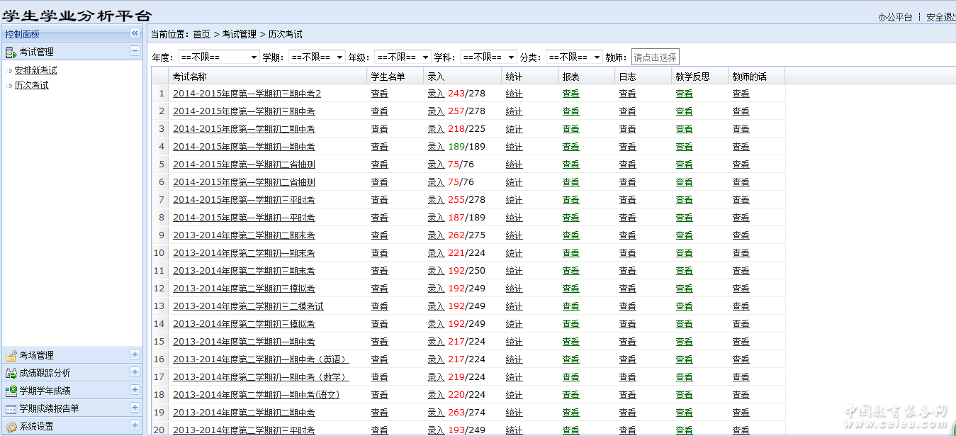 考試管理:歷次考試管理、考試安排、考分錄入(導(dǎo)入)、成績統(tǒng)計(統(tǒng)計多達(dá)140個成績指標(biāo))、單次考試的結(jié)果分析(分班級成績分析和學(xué)生成績分析)、錄入日志、教師對本次考試的教學(xué)反思、教師對學(xué)生的鼓勵等。