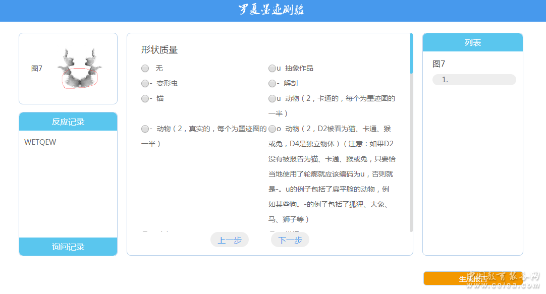 產品詳細介紹 羅夏墨跡測驗系統是依據羅夏墨跡測驗原理,由專業心理學家設計的集記錄、編碼、計算和報告于一體的系統,旨在促進提高咨詢師的工作效率,實現編碼自動化和案例集中管理的一款高效、便捷、在線系統。 瑞格羅夏墨跡測驗系統主要是有標記、編碼和報告三個部分:這三個部分是緊緊聯系在一起的,咨詢師根據被試的反應對圖卡進行標記,然后對照圖卡編碼,編碼完成后,自動生成結構化表、解釋等。此系統的主要功能是使編碼精確化、計算自動化,一方面為咨詢師節約計算時間,另一方面提供對來訪者的解釋參考。聯系電話:13552702599 |
