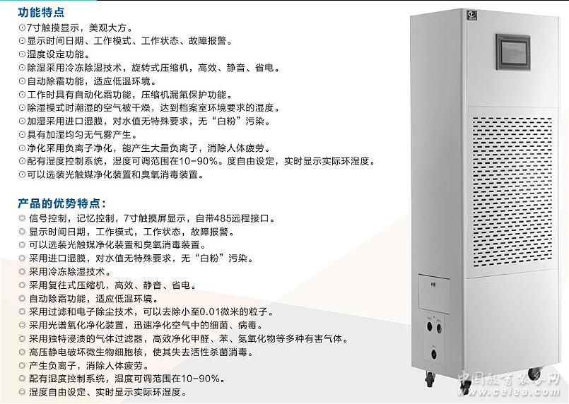 產品的優勢特點: ◎ 信號控制,記憶控制,7寸觸摸屏顯示,自帶485遠程接口。 ◎ 顯示時間日期,工作模式,工作狀態,故障報警。 ◎ 可以選裝光觸媒凈化裝置和臭氧消毒裝置。 ◎ 采用進口濕膜,對水值無特殊要求,無“白粉”污染。 ◎ 采用冷凍除濕技術。 ◎ 采用復往式壓縮機,高效、靜音、省電。 ◎ 自動除霜功能,適應低溫環境。 ◎ 采用過濾和電子除塵技術,可以去除小至0.01微米的粒子。 ◎ 采用光譜氧化凈化裝置,迅速凈化空氣中的細菌、病毒。 ◎ 采用獨特浸漬的氣體過濾器,高效凈化甲醛、苯、氮氧化物等多種有害氣體。 ◎ 高壓靜電破壞微生物細胞核,使其失去活性殺菌消毒。 ◎ 產生負離子,消除人體疲勞。 ◎ 配有濕度控制系統,濕度可調范圍在10-90%。 ◎ 濕度自由設定、實時顯示實際環濕度。