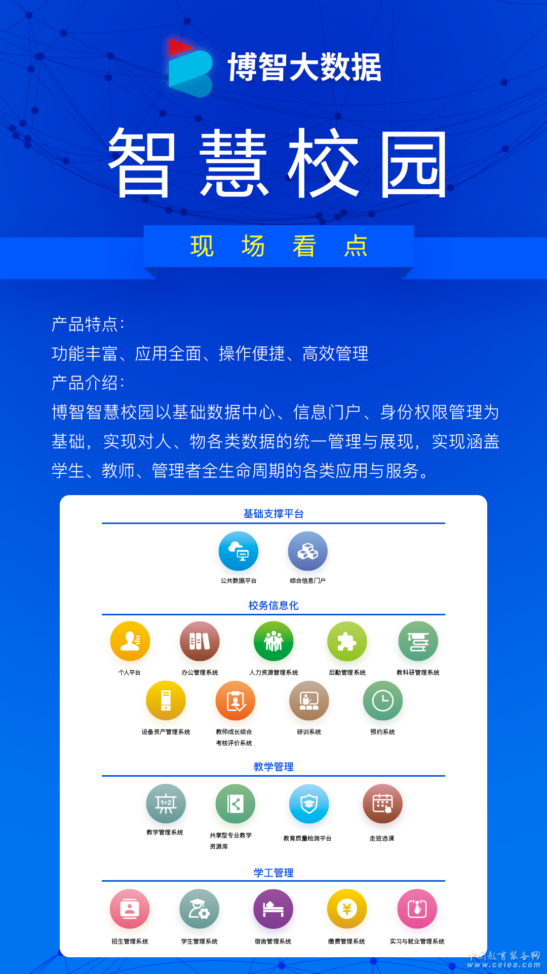 產(chǎn)品詳細(xì)介紹博智智慧校園,該產(chǎn)品功能豐富、應(yīng)用全面、使用簡(jiǎn)單、管理高效,涵蓋了綜合信息門(mén)戶,辦公管理系統(tǒng)、人力資源管理系統(tǒng),后勤管理系統(tǒng),教科研管理系統(tǒng),設(shè)備資產(chǎn)管理系統(tǒng),教師成長(zhǎng)綜合考核評(píng)價(jià)系統(tǒng),教學(xué)管理系統(tǒng),共享型專(zhuān)業(yè)數(shù)據(jù)資源,招生管理系統(tǒng),學(xué)生管理系統(tǒng),宿舍管理系統(tǒng),繳費(fèi)管理系統(tǒng),實(shí)習(xí)與就業(yè)管理系統(tǒng)。