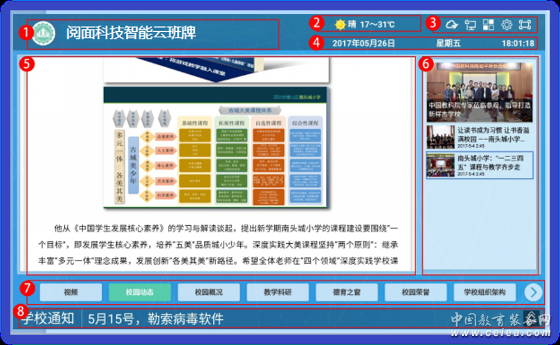 產品詳細介紹 ①顯示學校校徽及學校名稱; ②顯示當天的當地(綁定地區)天氣情況; ③推送狀態標識/網絡狀態標識/應用中心/系統設置/全屏顯示;(圖標從左到右排序) ④顯示當前的日期、星期、時間內容; ⑤內容顯示欄,顯示各模塊的內容; ⑥模塊內容標題欄目列表,顯示模塊內容標題及縮略圖,可上下滾動; ⑦菜單欄目,顯示各個各模塊的名稱;可左右滑動查看,也可點右邊的”箭頭“實現查看右邊隱藏的模塊; ⑧學校通知欄目,顯示學校通知內容(僅顯示文字,圖文需點擊“更多”查看),“更多”顯示學校通知歷史消息。