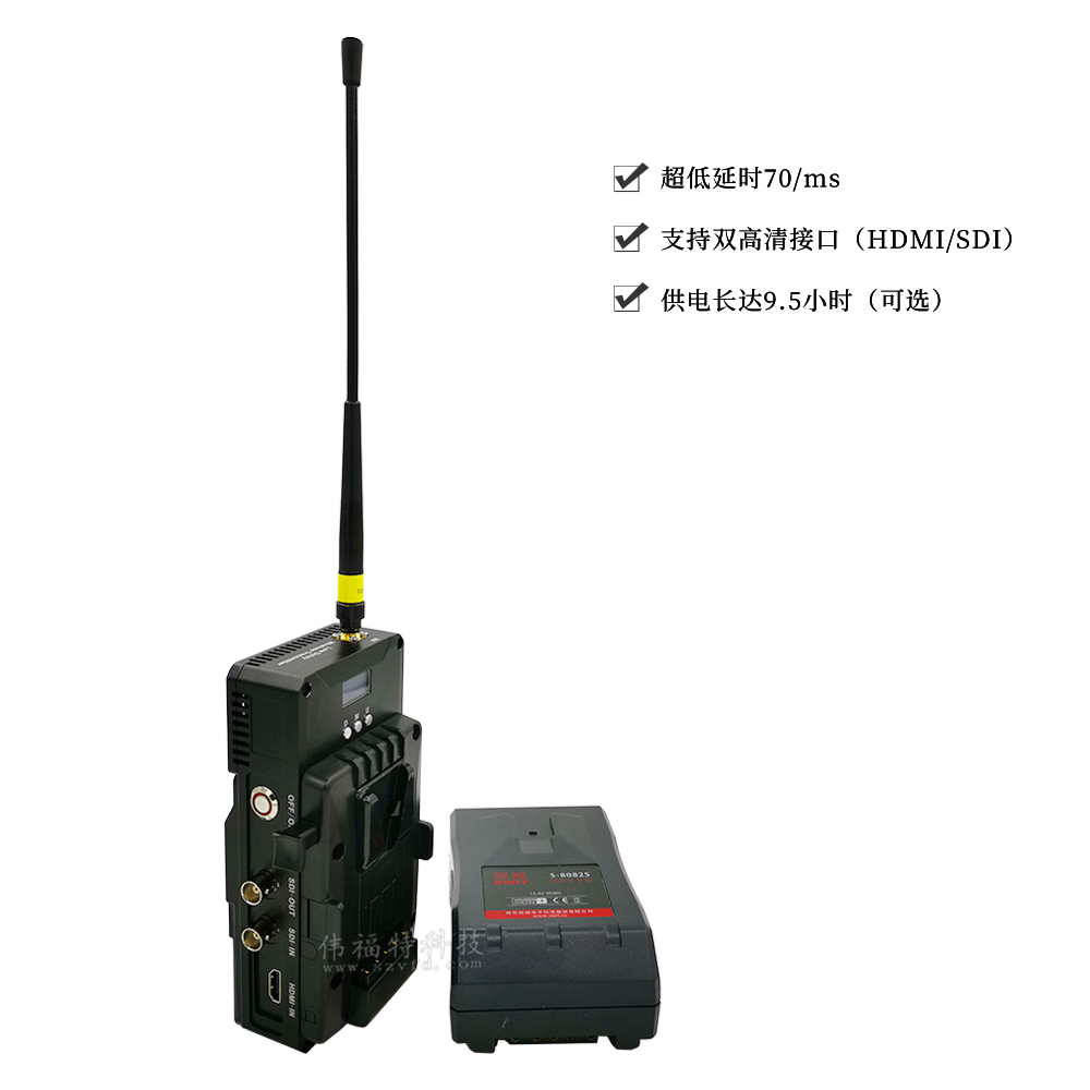 低延時,系統延時為70毫秒 針對廣電行業應用設計 音視頻接口:數字SDI、HDMI雙接口 SDI高清環出接口,可監視顯示 機身前后嵌入SONY V型扣,直接卡入專業攝像一體機使用 發射與接收自帶熱靴、三角架固定孔位 手動可設置六位數字密碼組合動態AES加密 設備自帶LCD液晶面板顯示參數、調節參數 接收機自帶LCD液晶顯示百分比信號強弱指示 工作頻帶1~8MHz液晶可調 發射功率:1W 高速移動及多徑干擾下可穩定傳輸圖像、語音 強大的NLOS非視距傳輸能力 具有空間分集接收能力 高效壓縮H.264數字視頻編碼標準 全高清HD1080P畫質(1920*1080) 165×82×52mm (L×W×H) 重量:600g 根據客戶要求,各種形式可定制