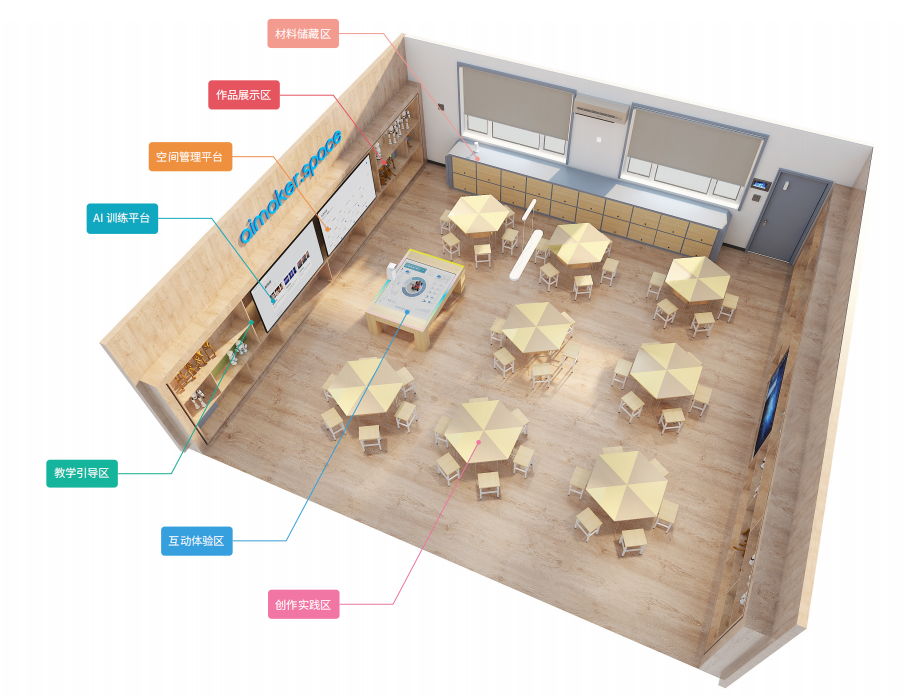 AI 教學(xué)空間分為教學(xué)引導(dǎo)區(qū)、創(chuàng)作實(shí)踐區(qū)、互動體驗(yàn)區(qū)、作品展示區(qū)及材料儲藏區(qū)。