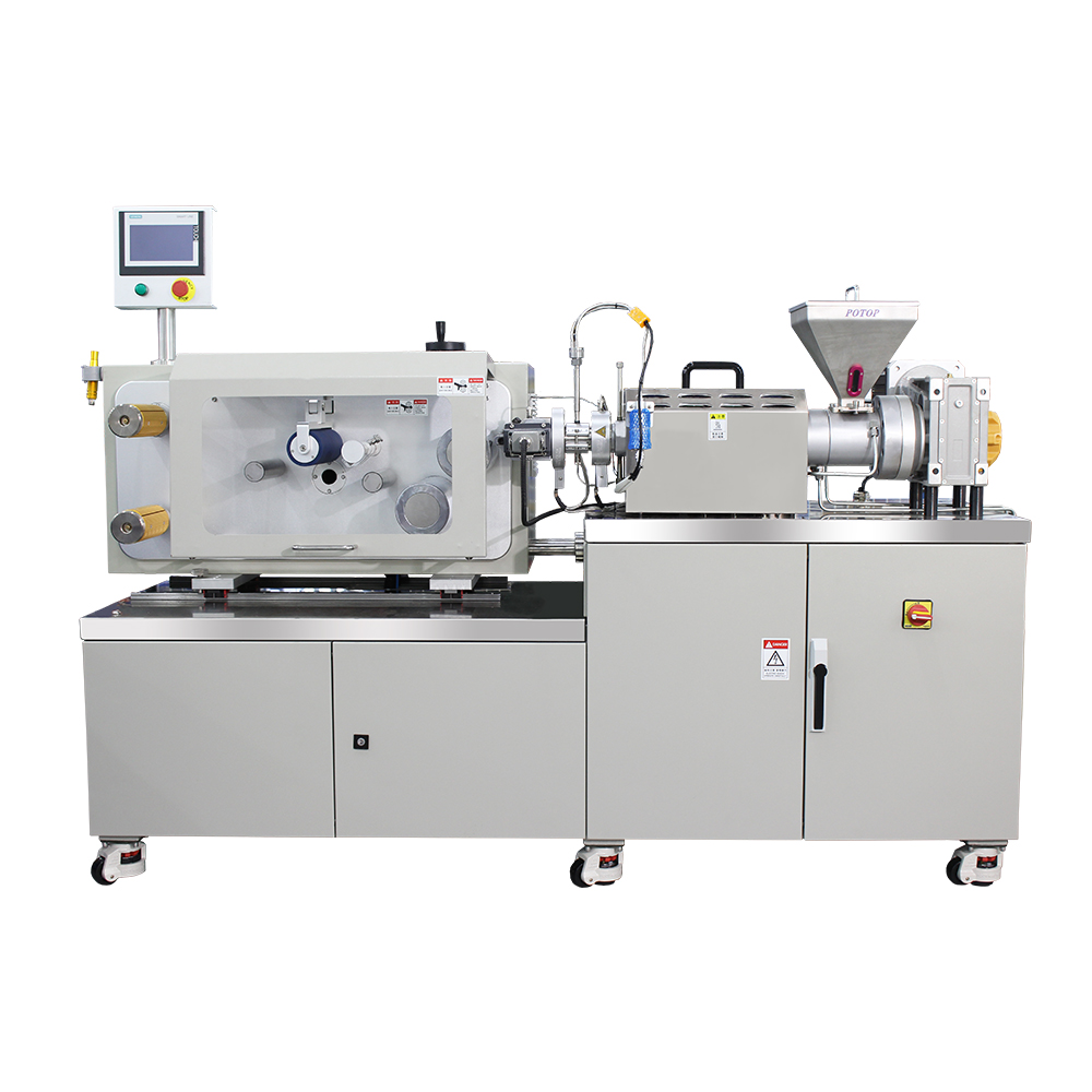 桌面流延機由精密螺桿擠出機、模頭、流延輥、冷卻輥、牽引輥、收卷輥組成,螺桿由20到30 ,長徑比1:28 ,可配100或150mm模頭。適合各種聚合物擠出流延不同厚度的試樣和小批量生產。