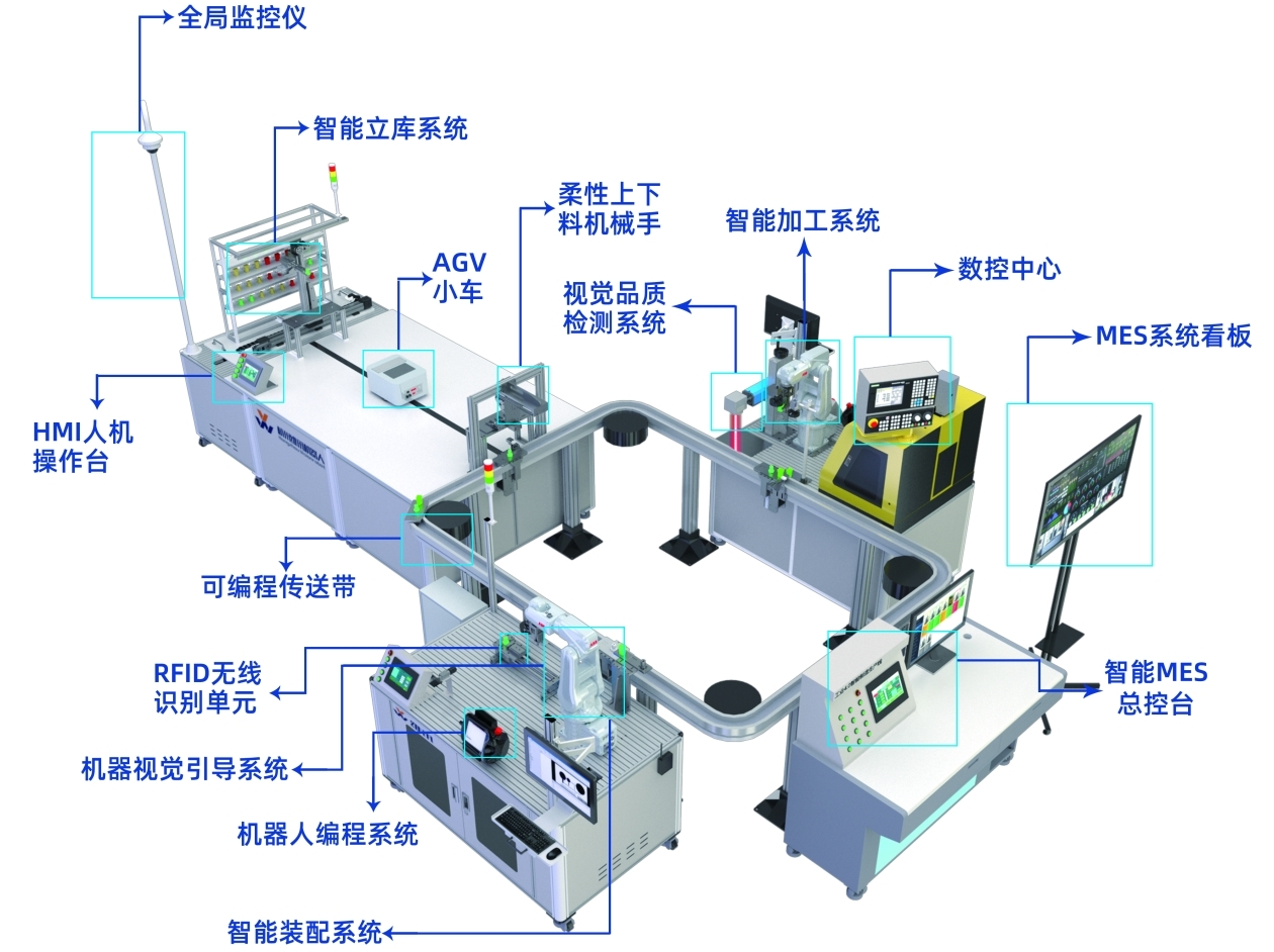 產品各組成單元 MES制造執行系統在未來的工業4.0工廠里,智能設備、智能產品與智能管理系統相互交流,并與ERP、PLM、云數據等進行通信聯絡,構成一個巨大的通信網絡。維視工業4.0 MES系統基于數據庫技術,生產線的信息傳送過來后都存在系統的數據庫中,MES通過訪問數據庫對信息進行處理和展示。同時我們還可以實現MES與ERP的對接以及其它系統的對接,實現更大面的信息共享。 智能立體倉庫按實際立體倉庫工作原理設計,包括貨架、堆垛車、輸送線等部分,組成縮合性自動化實訓平臺。 ● 傳感器技術 ● 人機介面 ● PLC控制 ● 電機驅動技術 ● 伺服系統 ● Rfid技術 ● 氣動系統 ● Wifi通信 ● 真空系統 ● 標準接口 智能機器人裝配智能AGV機器人配合自動料盒更換裝置,加上智能立體倉庫實現完全智能的物流倉儲功能。機器人技術應用是未來工廠里的重要內容,智能機器人裝配工站將機器人、機器視覺、PLC等集成在一起,構成了一套全自動化的智能生產系統。 ● 工業機器人 ● 電機控制 ●傳感器 ● 夾具設計 ● 機器視覺 ● 機器人焊接 ● 安全保護 ● 氣動系統 智能加工MES是整個智能工廠的大腦,是收集信息、加工信息、處理信息的地方,通過與生產硬件的配合,實現智能化的生產過程。在未來工廠內,智能化的加工設備通過與產品通信,得到產品需要加工的內容,自動按照要求的加工內容進行定制化加工,這樣的場景在這里也得到了展現。 ● 智能激光打標加工 ● wifi通信 ● 網絡通信 ● 個性化加工 ● RFID