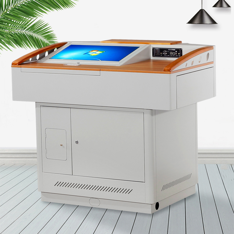 產(chǎn)品詳細介紹1.外形尺寸:1150*780*1000mm;上柜體:長度1150mm,寬度780,高度330mm;下柜體:長度850mm,寬度660mm,高度670mm;底座部分:長度810mm,寬度630mm,高度65mm. 2.采用0.9 mm-1.2mm優(yōu)質(zhì)精裝冷軋鋼板,經(jīng)數(shù)控激光切設(shè)備加工而成,表面酸洗、磷化、防腐、防銹、鈍化處理后靜電噴塑(顏色用戶可選定),塑面經(jīng)久耐用。 3.講臺桌面固定顯示器設(shè)置,上面添加8MM鋼化玻璃。右臺面前方可選放多功能接口板等,右前方平面可放筆記本等設(shè)備; 桌面四周半包圍結(jié)構(gòu),有效防止物品滑落; 4.講臺右側(cè)設(shè)置隱藏式抽拉展臺抽屜(長*寬*高:500*500*170 mm) 5.講臺扶手,背板采用高檔橡木制成,表面噴高檔防滑漆,使用起來光滑度高,桌面顏色為木紋色,使整個講臺看起來美觀大方。 6.整體沖壓成型,整體結(jié)構(gòu)緊湊,空間設(shè)計合理; 7.講臺下柜前后門均可打開,電腦主機的光驅(qū)和USB接口設(shè)有專門的可開合小門,方便放設(shè)備,后方有上下門,便于檢修設(shè)備,下門沖散熱孔,方便散熱;整個下柜可作為儲物柜使用; 8.全部的加工件均采用模具成型,激光切加工而成、配合優(yōu)良的焊接工藝,保障尺寸精度及各部件一致性,保證安裝的方便快捷。 9.整個講臺采用上下分體,拼裝組成,大大的減少了運輸成本。 |