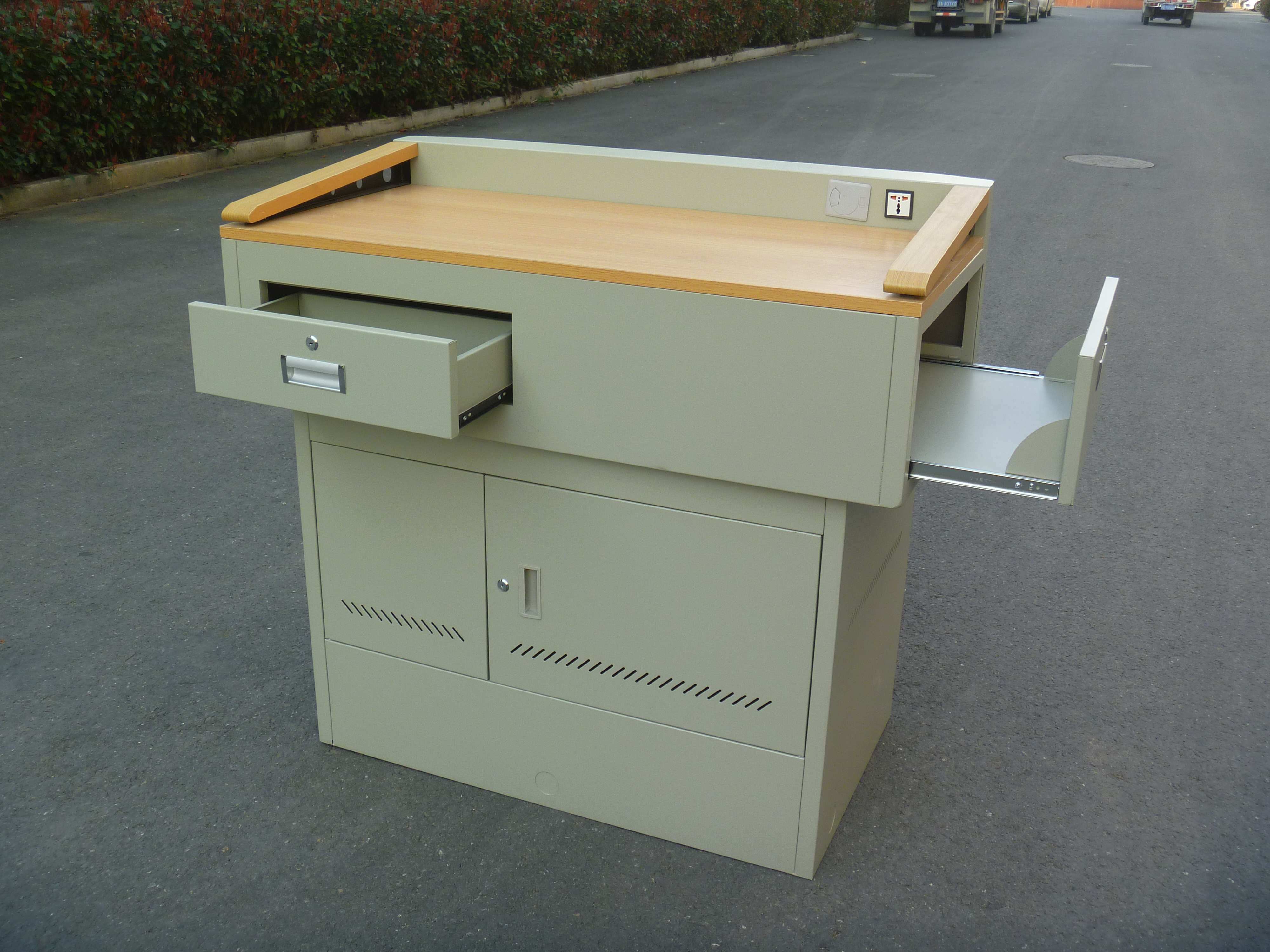 產(chǎn)品詳細介紹講臺采用上下分體式結構設計,下體為焊接一體不可拆分,以保證牢固性。二側采用紅色扶手,桌面左、前、右三邊緣凸起,防止教具滾落。采用脫脂、除酸、磷化、靜電噴塑等工藝,防腐耐候性強,美觀耐用。邊緣及拐角采用圓弧設計,避免尖角,確保師生安全。;材質采用料測0.8-1.5mm優(yōu)質冷軋鋼板。 講臺帶防盜、防水、防火、防塵、散熱等功能設計。 前門采用左右開門式設計,方便設備的操作及維護,前門下邊沿距離地面高度不低200mm。 一把鑰匙開啟講臺所有鎖,方便設備操和和維護; 講臺前側配有儲物抽屜,可放置書本、作業(yè)本、粉筆等物品;講臺后上檔配有二三眼電源插座、桌面配有走線盒,可方便老師帶筆記本接電源,使用起來更方便。 桌面邊、角采用平滑圓弧過渡、尖角處為圓球角,確保學生安全;表面采用整體酸洗磷化及靜電噴塑處理,塑粉吸附力強,表面光潔。 下柜體周圍設有電源線、信號線等進出口位置,方便各線纜的進出,內(nèi)部設有理線架,使線纜布置井然不紊;并配有防靜電接地柱,有效防止靜電。 |