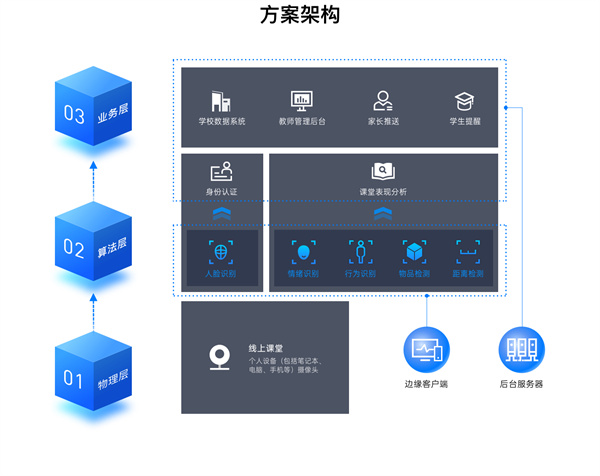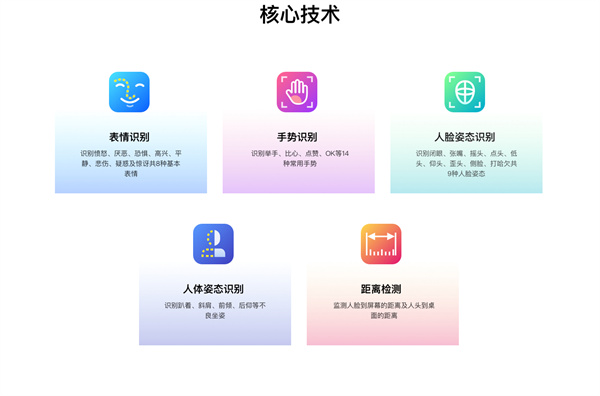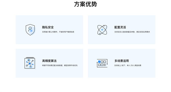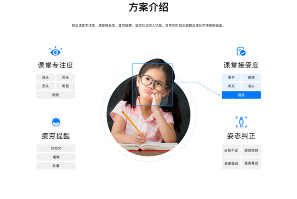 360在線教育AI學情分析解決方案包括課堂專注度、課堂接受度、疲勞提醒、坐姿糾正和視力保護5大解決方案,通過姿態識別、表情識別、距離檢測等維度分析學生行為,協助學生健康管理、為教學質量評估提供數據支撐。