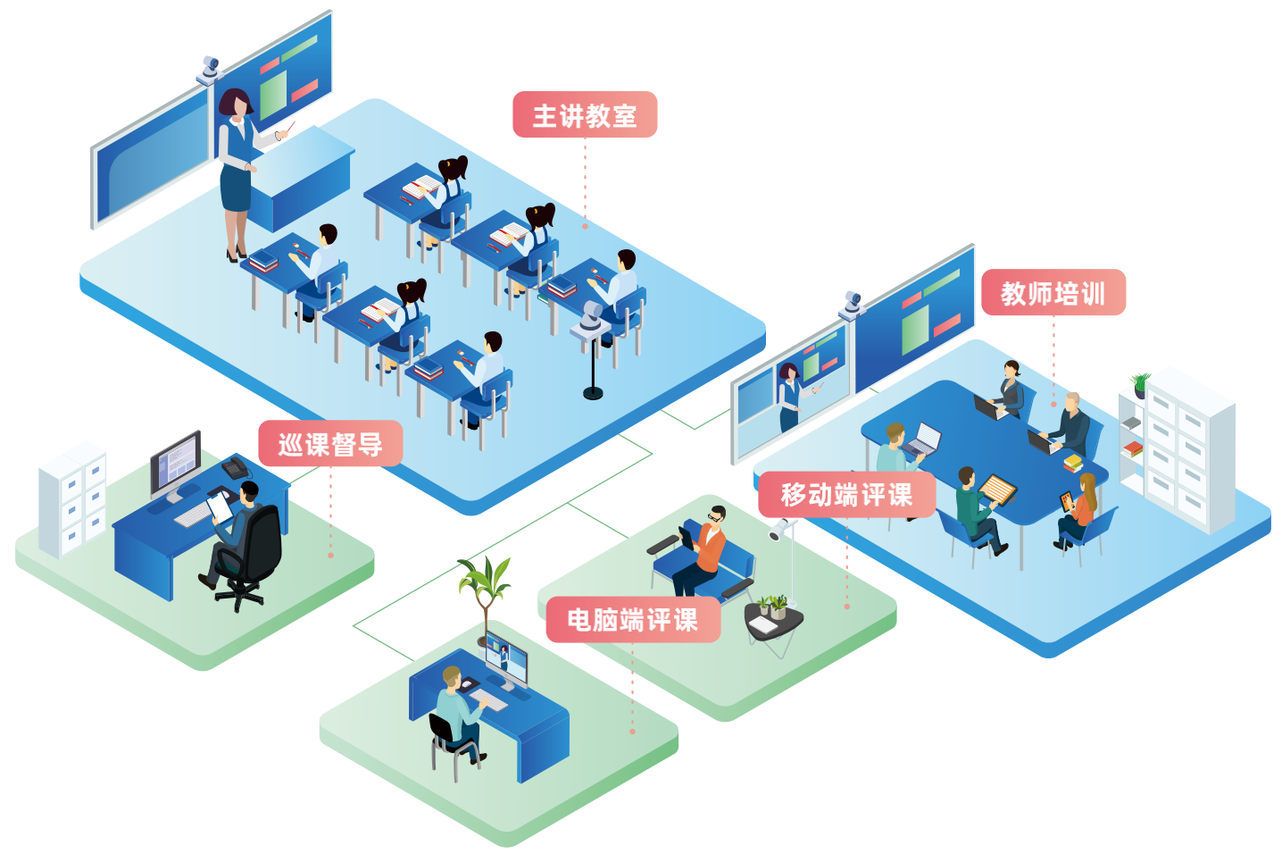 • 課前備課、教材研訓;課中教學觀摩、互動評課課后點播評課、教學反思及培訓