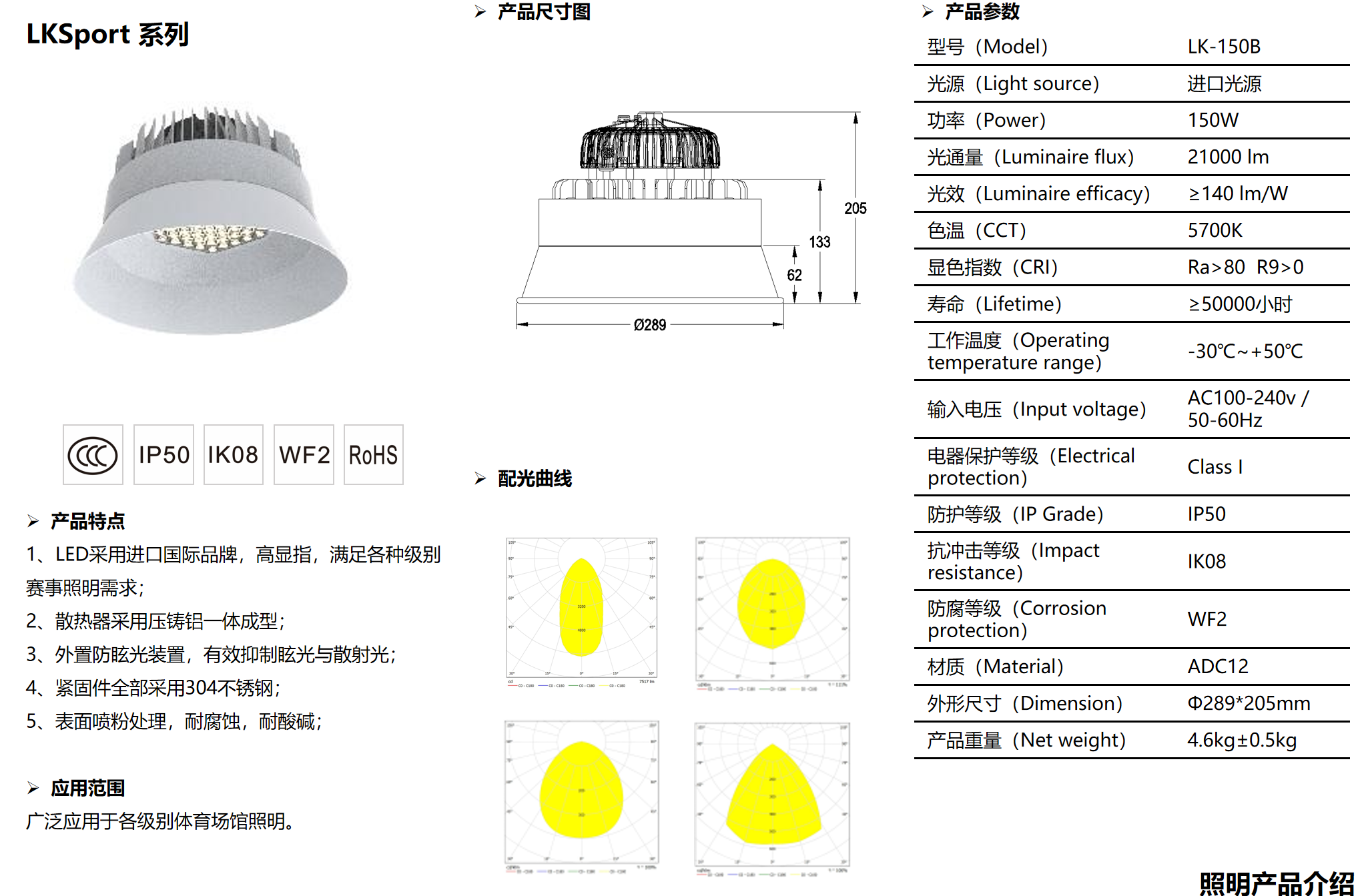 產(chǎn)品詳細介紹1、LED采用進口國際品牌,高顯指,滿足各種級別賽事照明需求;2、散熱器采用壓鑄鋁一體成型;3、外置防眩光裝置,有效抑制眩光與散射光;4、緊固件全部采用304不銹鋼;5、表面噴粉處理,耐腐蝕,耐酸堿 型號(Model) LK-150B 光源(Light source) 進口光源 功率(Power) 150W 光通量(Luminaire flux) 21000 lm 光效(Luminaire efficacy) ≥140 lm/W 色溫(CCT) 5700K 顯色指數(shù)(CRI) Ra>80 R9>0 壽命(Lifetime) ≥50000小時 工作溫度(Operating temperature range) -30℃~+50℃ 輸入電壓(Input voltage) AC100-240v / 50-60Hz 電器保護等級(Electrical protection) Class I 防護等級(IP Grade) IP50 抗沖擊等級(Impact resistance) IK08 防腐等級(Corrosion protection) WF2 材質(zhì)(Material) ADC12 外形尺寸(Dimension) Φ289*205mm 產(chǎn)品重量(Net weight) 4.6kg±0.5kg |